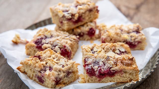 Streuselkuchen mit Kirschen, Marzipan und Mandelblättchen! Muss man dazu noch was sagen? Also, schnell ran an den Backofen!