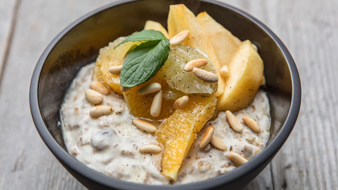 Dattel-Ingwer-Porridge mit Bratapfel und Zitrussalat