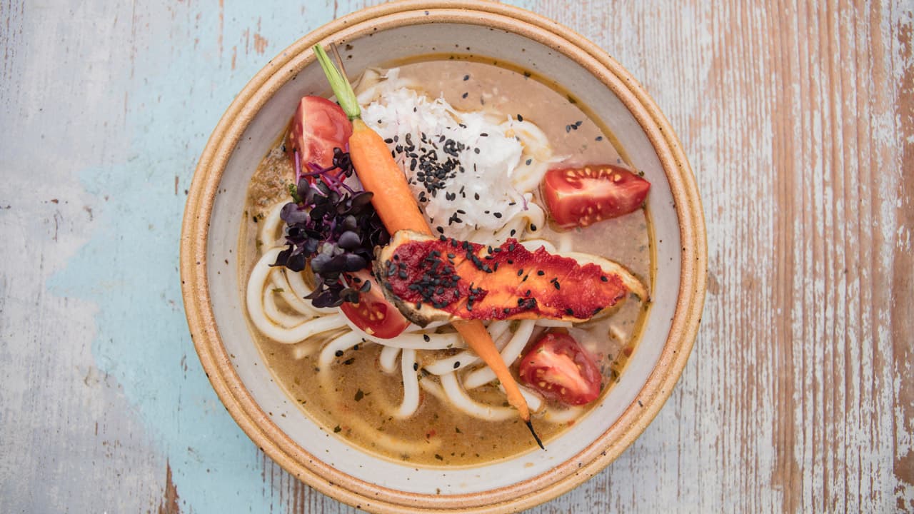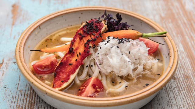 Udon Nudelsuppe mit Ofen-Gemüse