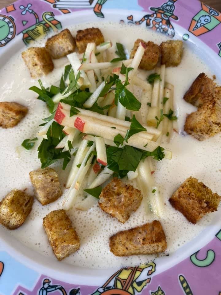 "Es ist und bleibt meine absolute Lieblingssuppe: Blumenkohl-Cremesuppe mit Curry Croûtons und Apfelsalsa aus Essentials Vol. 2. Wegen akuter Koriander-Ablehnung eines Mitessenden mit Petersilie."