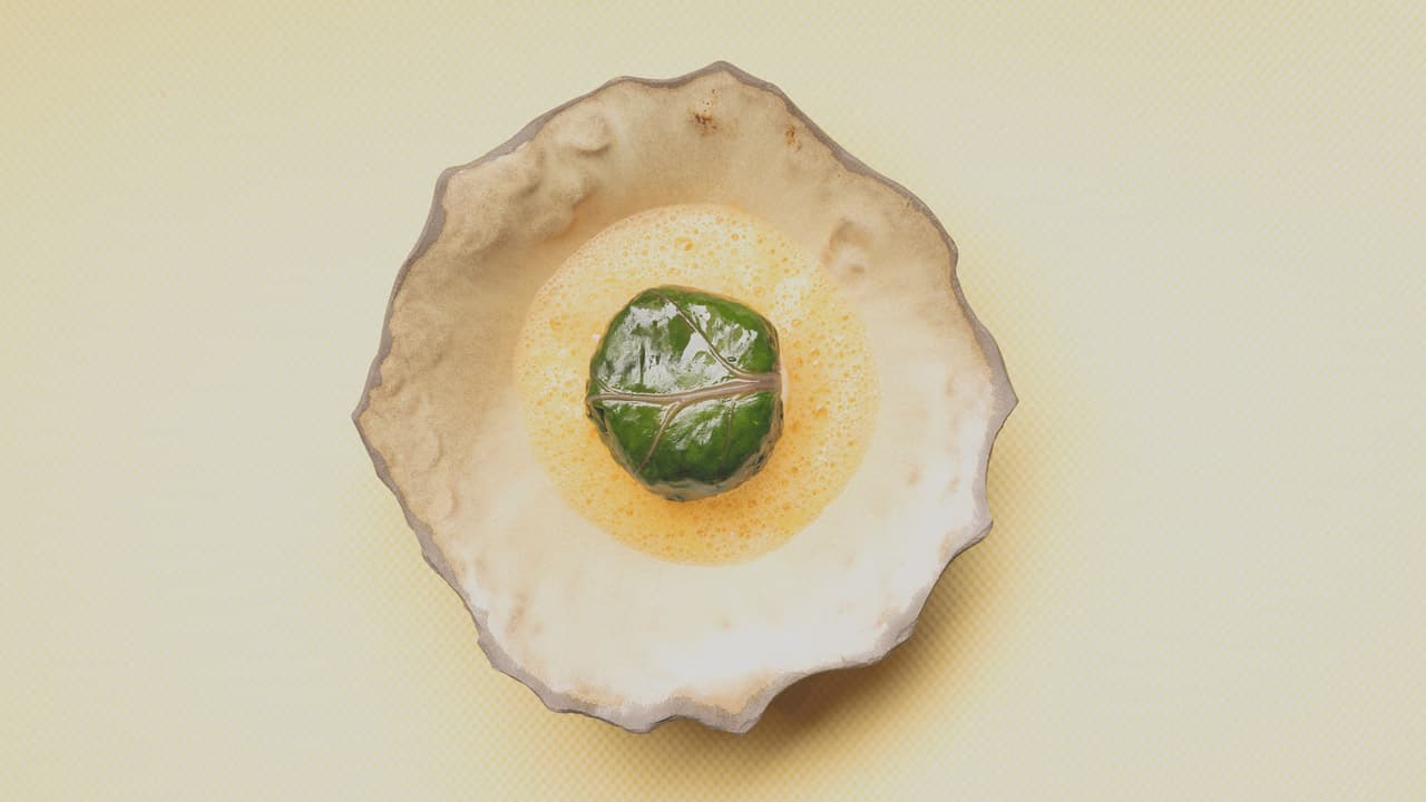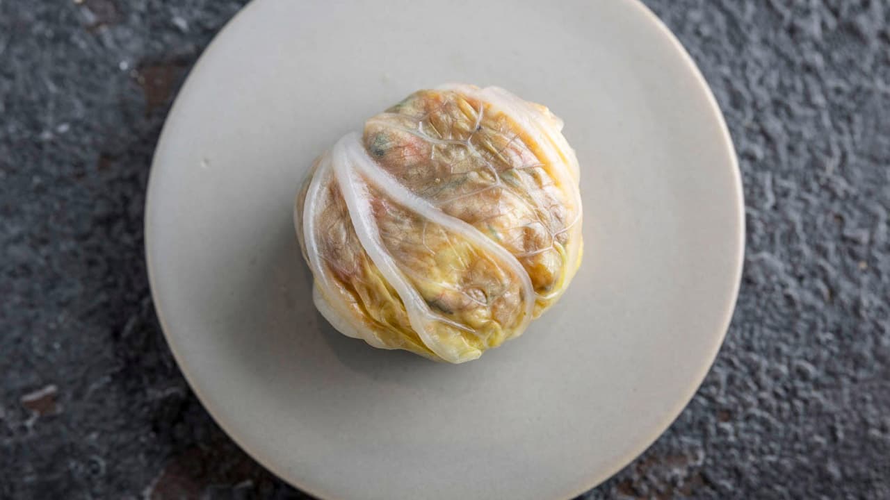 1. Gang: Chinakohl-Grünkern-Päckchen mit Kräuter-Muffin, Tomatenschaum & Cashew-Sauercreme