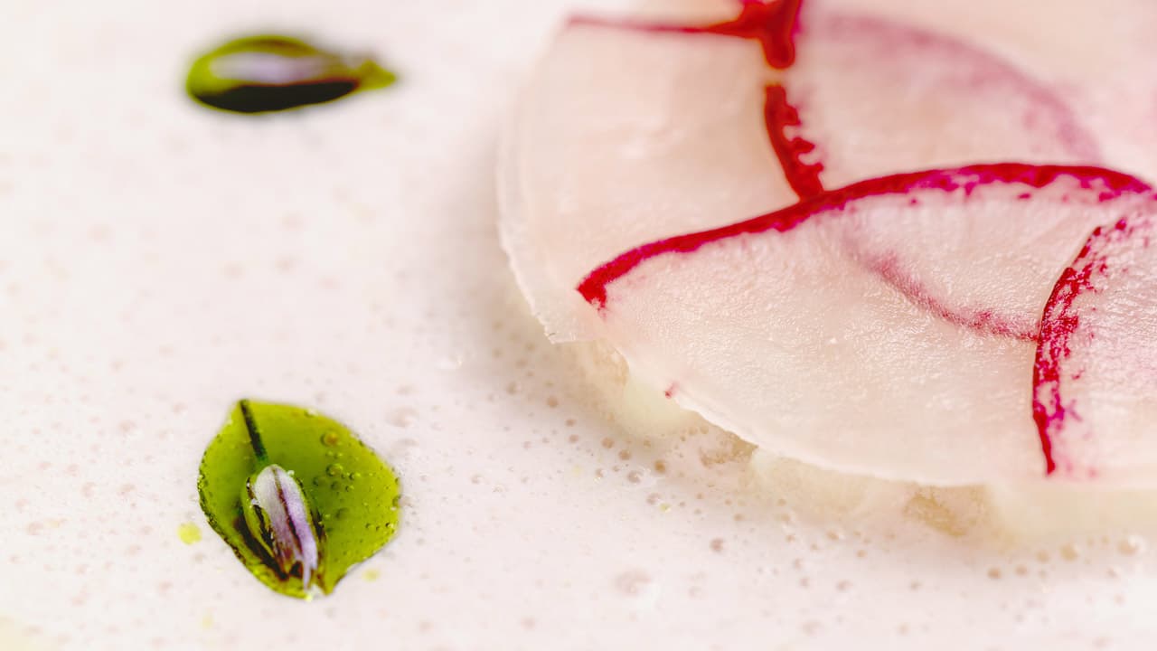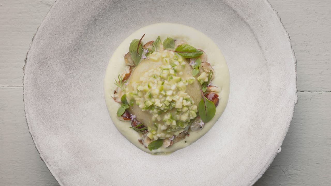 3. Gang: Koji-Kohlrabi-Filet mit Kohlrabi à la Creme, Spargel-Vinaigrette und Haselnuss