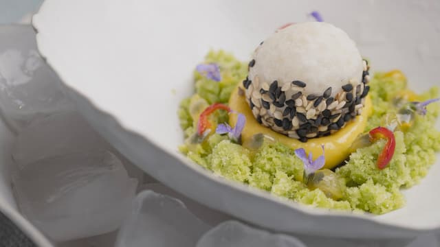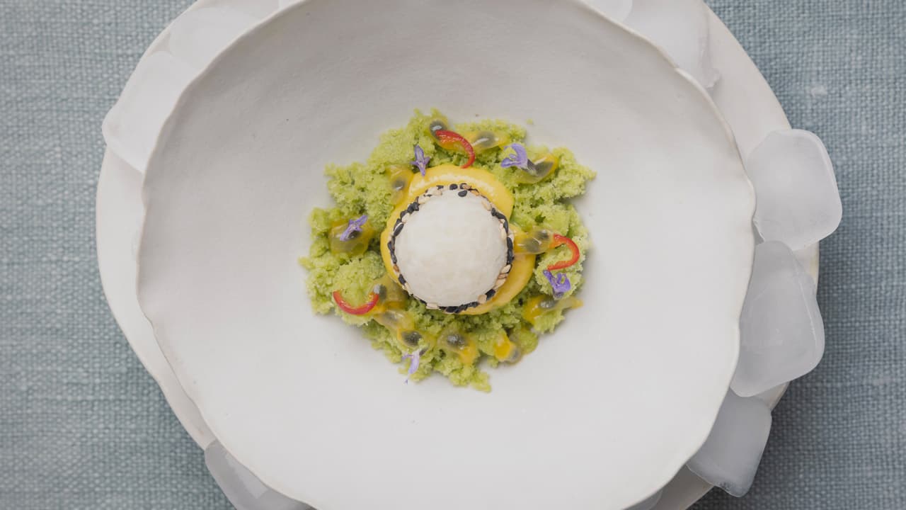 4. Gang: Kokos-Milchreis mit Mango-Maracuja-Creme und Koriander-Zitronen-Granité