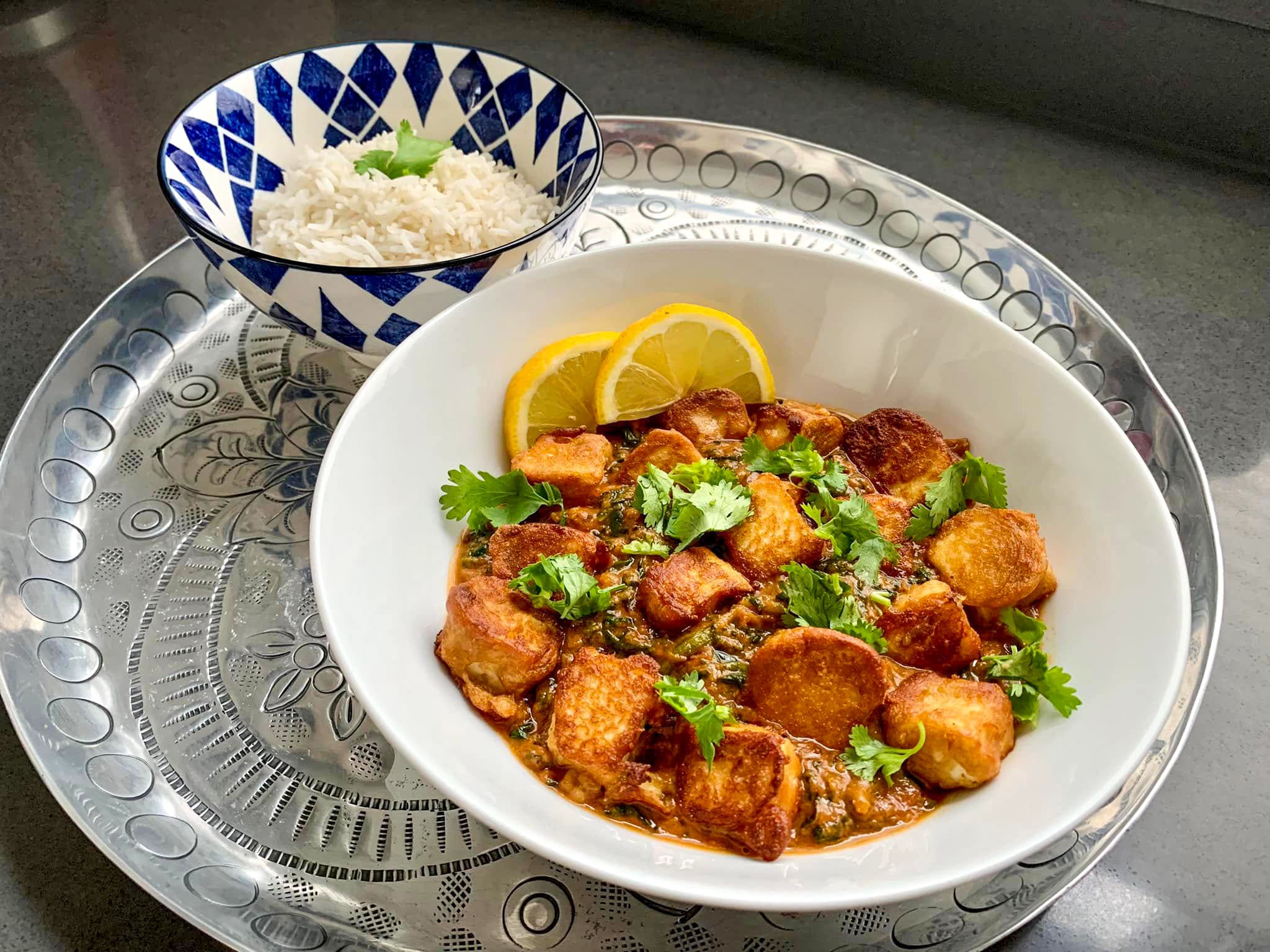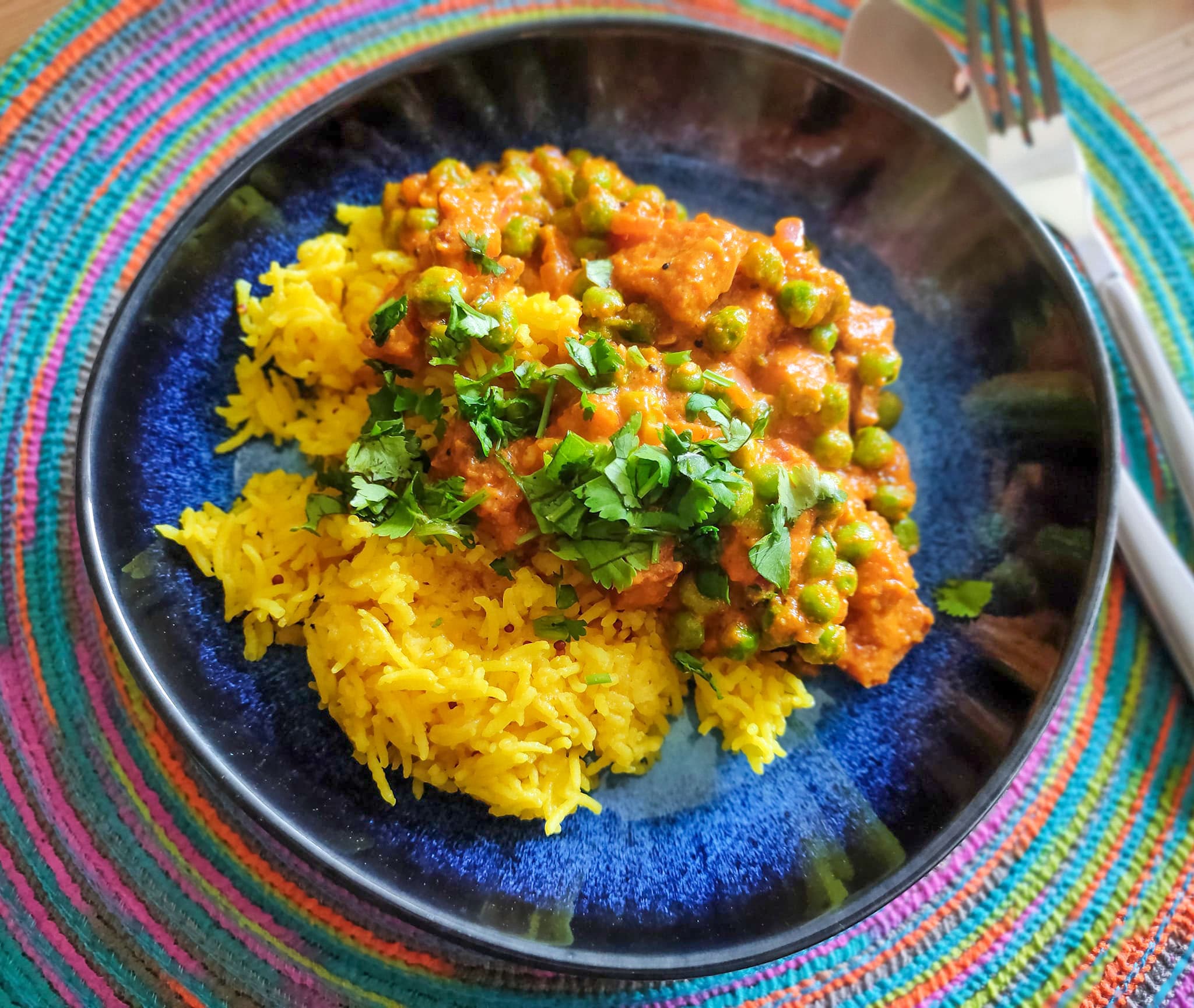 "Matar Paneer - bisher mein Favorit aus der Indian Masterclass. Fantastisch! Basierend auf meiner letzten Erfahrung habe ich heute gleich die doppelte Menge Tofu gemacht, um ohne schlechtes Gewissen schon bei der Zubereitung naschen zu können."
