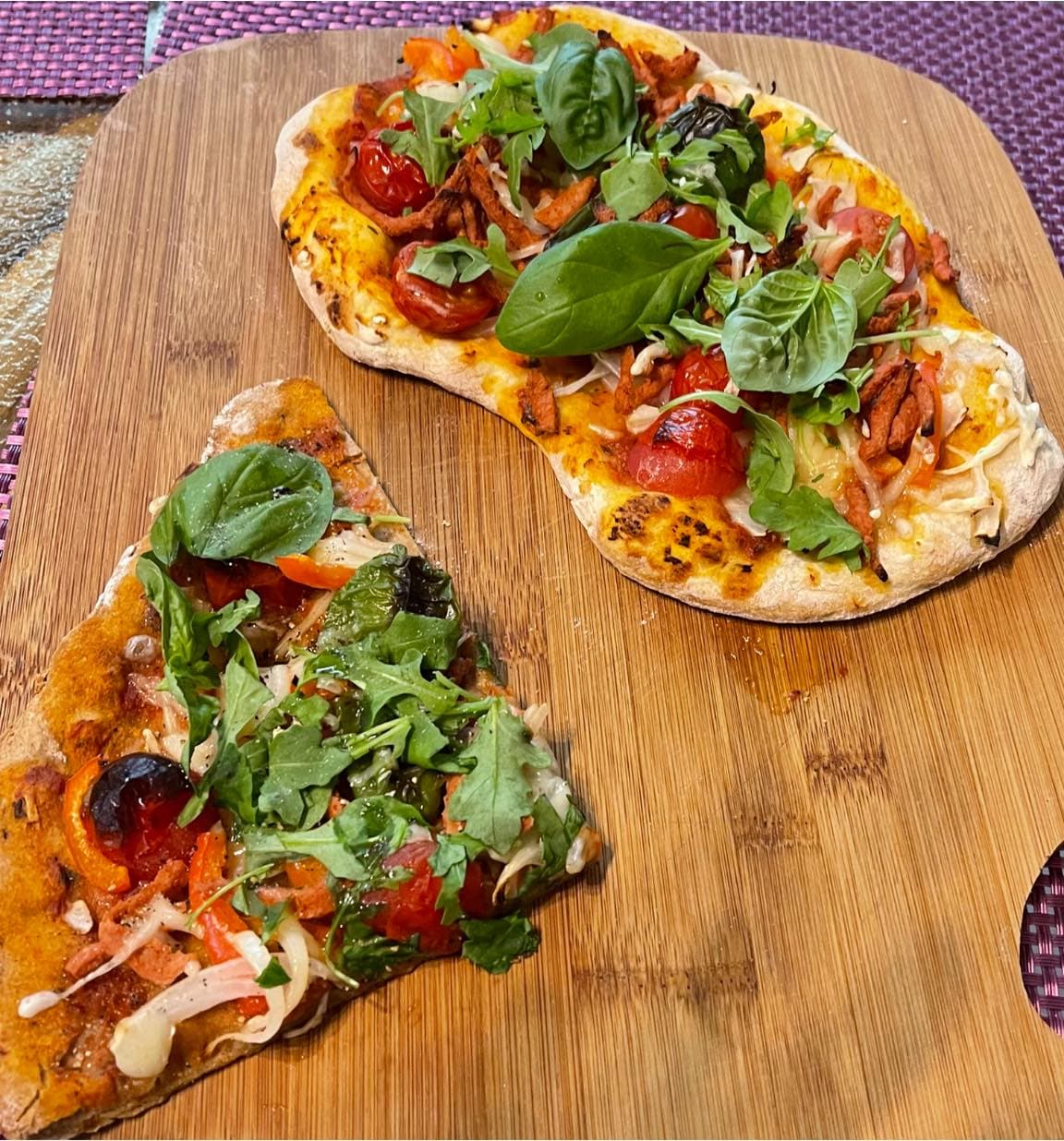 „Italienischer Abend, Pizzabrötchen und Kräuterbutter, Pizza und Dinkelvollkornpizza, beide sehr lecker."