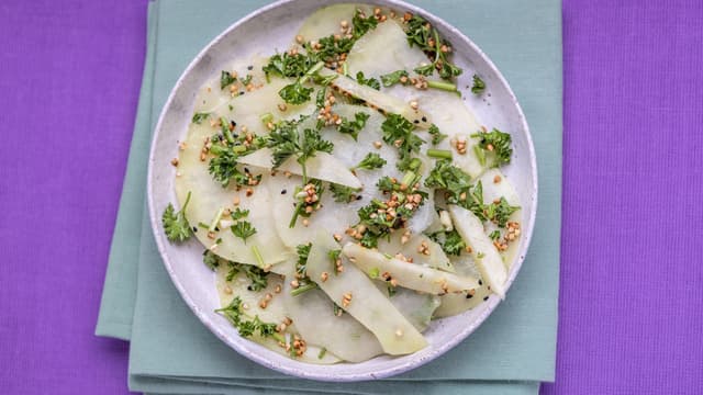 Koriander schmeckt wie Seife für dich? Dann wird es dich freuen, dass du dieses Gericht dennoch probieren kannst! Denn hier ist der Star auf dem Teller die Koriandersaat. Und diese schmeckt völlig anders als die Korianderblätter! Zwar verwendet Pascal hier auch die Blätter, aber eher als Frischegefühl. Du kannst sie durch Kerbel oder Petersilie ersetzen. Zusammen mit Mandeln wird die Koriandersaat geröstet und gemahlen und bildet ein knuspriges Topping auf dem erfrischenden Gurkensalat.