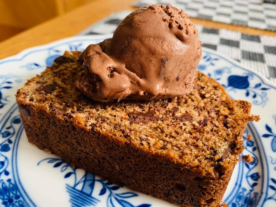 „Ja, ich weiß, viele von euch sind gerade im Fitness-MC-Modus, aber ich bin schwach und brauche heute Schokolade: Schokostückchen in Leas Bananenbrot aus der To Go MC, getoppt mit selbst gemachtem Schokoladeneis in dem sich Browniestückchen tummeln.“