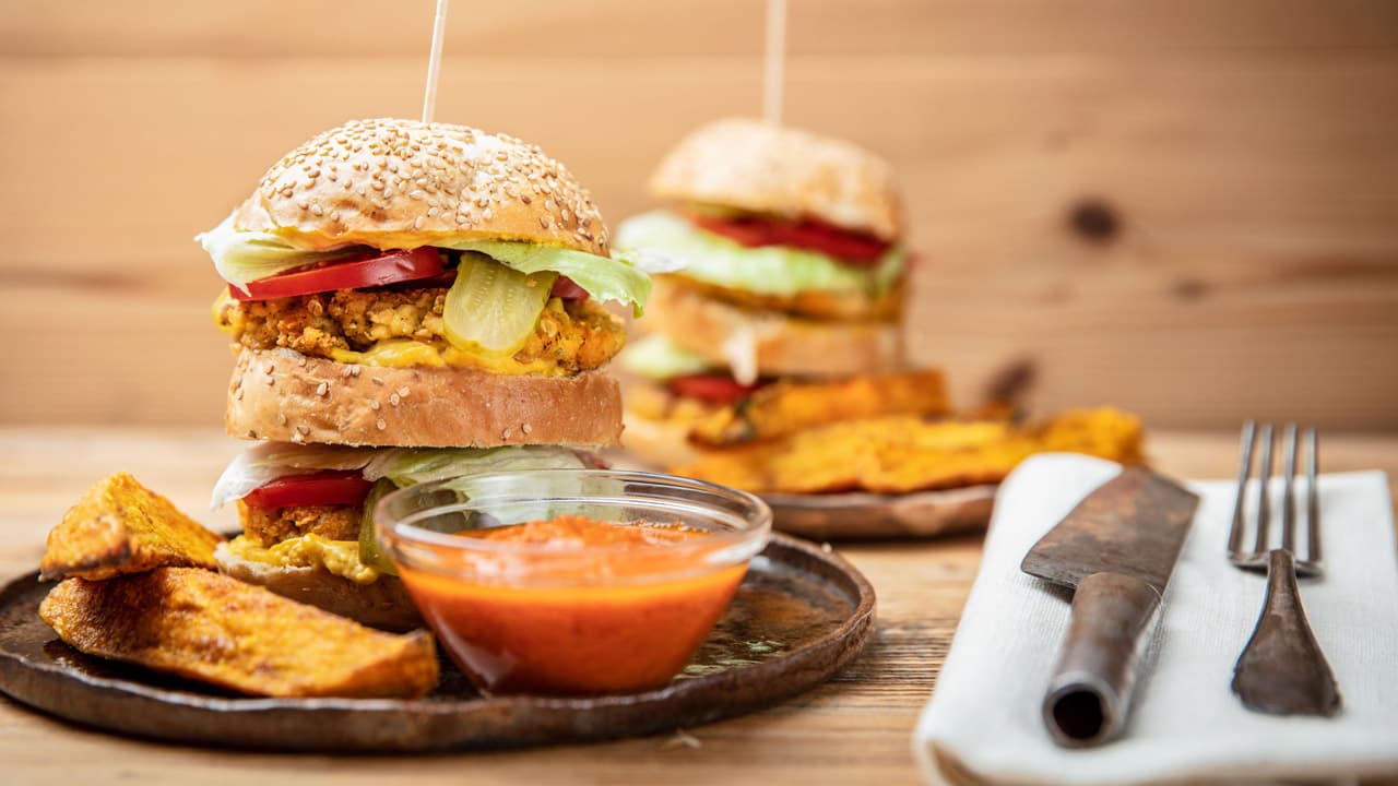 Kids' Burger mit selbstgemachter Mayo, Ketchup und Pommes