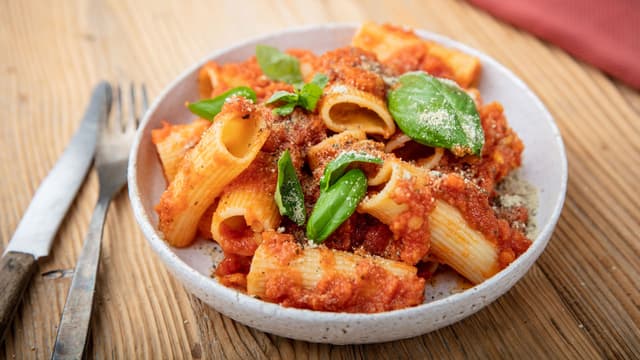 Versteckte Gemüse-Bolognese mit Rigatoni
