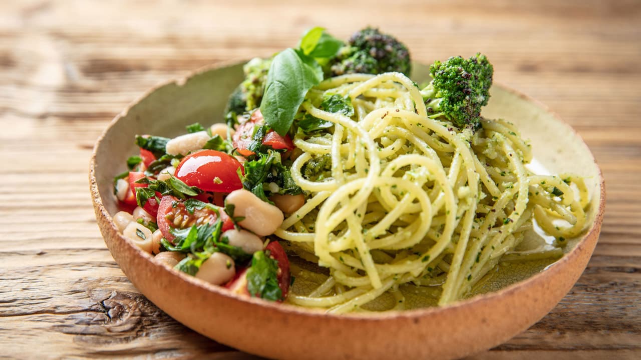 Spaghetti al Pesto mit Mohn-Brokkoli und Bohnen-Tomaten-Salat