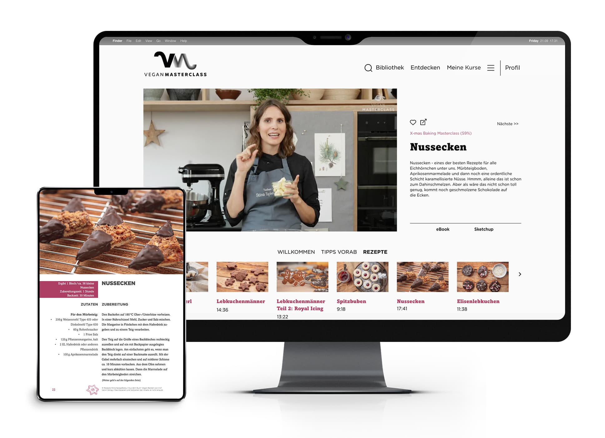 In der X-Mas Baking Masterclass backt Stina Spiegelberg mit dir die absoluten Klassiker zur Weihnachtszeit. Ob es saftige Nussecken sind, fruchtige Elisenlebkuchen, ein Quarkstollen oder Spitzbuben. Mit dem weihnachtlichen Zauber, der in der Luft liegt, und Stinas Rezepten, wird das eine wunderbare, besinnliche und super leckere Zeit!